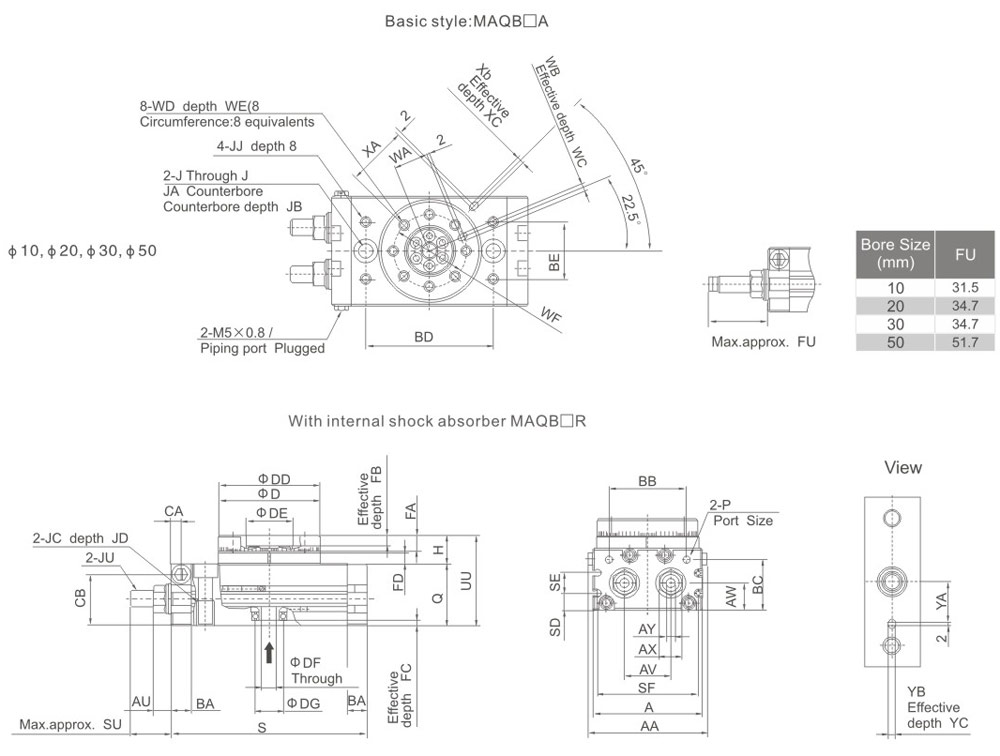 Bore size | Q | S | SD | SF | SU | UU | WA | WB | WC | WD | WE | WF | XA | XB | XC | YA | YB | YC |