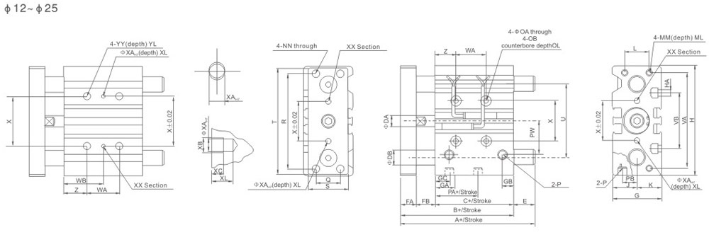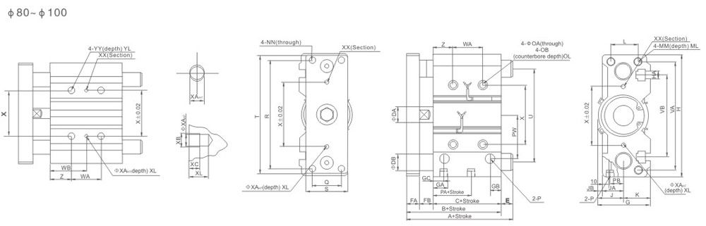 Bore size | Standard stroke (mm) | PW | Q | R | S | T | U | VA | VB | WA | WB | X | XA | XB | XC | XL | YY | YL | Z | ||||
