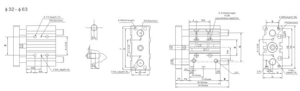 Bore size | Standard stroke (mm) | OB | OL | P | PA | PB | PW | Q | R | S | T | U | VA | VB | X | XA | XB | XC | YL | Z |