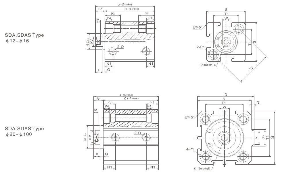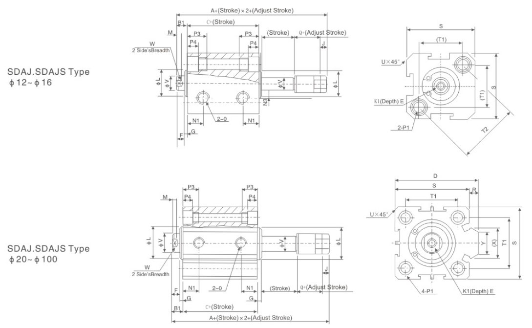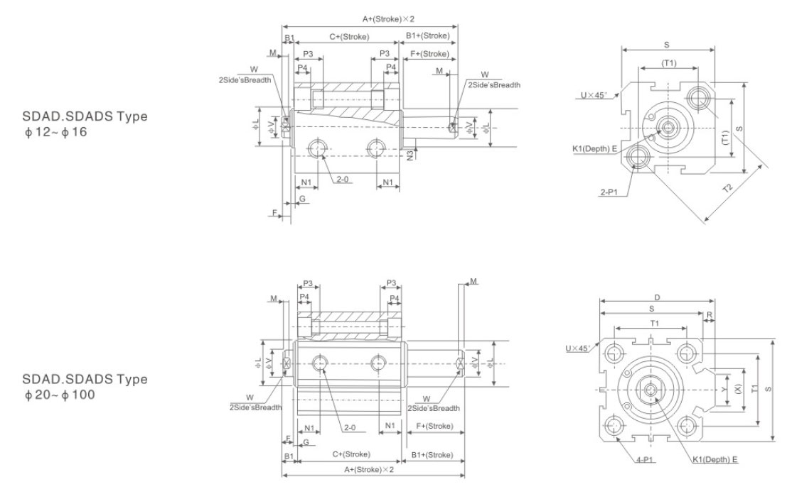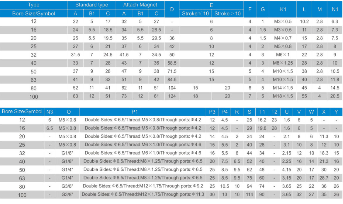 Bore Size/Symbol | A | B1 | C | A | B1 | C | Stroke≤10 | Stroke>10 | |||||||