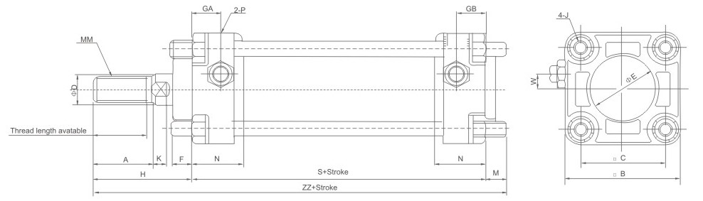 Diameter | Stroke range | Thread length available | A | □B | □C | φD | φE | F | GA | GB | J | K | M | MM | N | P | S | W | H | ZZ |
