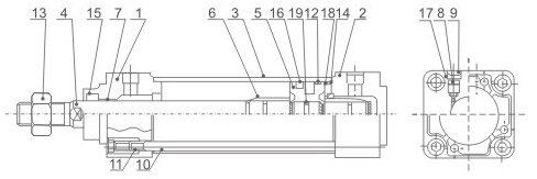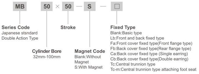 NO. Designation 1 Front cover 2 Back Cover 3 Barrel 4 Piston rod 5 Piston | NO. Designation 6 Buffe ring 7 Bearing 8 Cushion Screw 9 Cushion Seal 10 Tie rod | NO. Designation 11 Tie rod nut 12 Wear ring 13 Piston rod nut 14 Buffe seal ring 15 Piston O-ring |