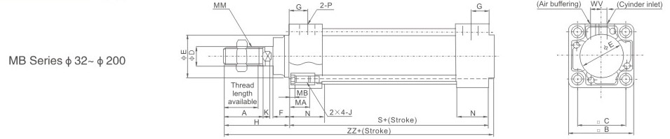 Diameter | Stroke range | Thread length available | A | □B | □C | φD | φE | F | G | MA | MB | J | K | MM | N | P | S | V | W | H | ZZ |